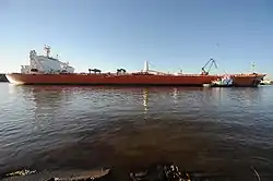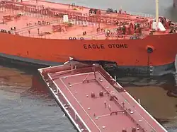 The barge collided with the tanker at about 09:30 local time on January 23, 2010,[2] in the Sabine-Neches Waterway[3] as the tanker, chartered by Exxon-Mobil from AET Incorporated to move oil to Exxon's refinery in Beaumont, Texas, moved upstream, and the barge was being maneuvered out of the harbor.[4] The collision tore a 15 × 8-foot (2.4 m) hole in the side of the tanker,[2] through 450,000 US gallons (1,700,000 L), or 1,500 tonnes, of crude oil, escaped. According to statements from the tanker's crew, the tank that was damaged contained 80,000 barrels (13,000 m3) of oil, of which 69,000 had been transferred to another tank, leaving 11,000 barrels (1,700 m3), or 450,000 US gallons (1,700,000 L) unaccounted for. According to local officials, however, there did not appear to be that much oil in the water, and some said that as little as a thousand barrels, or 42,000 US gallons (160,000 L), of oil had spilled. Coast Guard officials acknowledged that this might be the case, and that oil could have remained in the damaged tank.[5] Referring to the size of the spill, a Coast Guard officer said, "This is a big one." In response to the spill, emergency crews evacuated about 28 blocks of buildings around the site of the collision, but by the evening of the 23rd, residents had been allowed to return.[4]