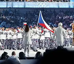 Of the flag-bearers who led their respective delegations, all but one were athletes, the exception being Fuad Guliyev, a skating official from Azerbaijan. The sport which was most represented among the flag-bearers was alpine skiing, as alpine skiers led 26 delegations. Only one delegation was led by a short track speed skater, Hong Kong, led by Han Yue Shueng.[1] Marjan Kalhor, an alpine skier and the flag-bearer for Iran, was both the first female flag bearer from her country and the first female athlete from her country to participate in the Winter Olympics.[2] It was erroneously pointed out by a Canadian TV commentator that Tomomi Okazaki was the first female flag bearer for Japan. This title goes to Seiko Hashimoto in Calgary 1988. Other prominent flag bearers included Canadian speed skater and five-time Olympian Clara Hughes, American luger Mark Grimmette, who had helped carry the American flag during the 2002 Winter Olympics, and Czech hockey player Jaromír Jágr. Hughes is the only Olympian ever to win multiple medals at both the Summer and Winter Olympics.[3]
