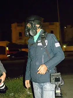 Protests began on 14 February 2011,[78] but met immediate reaction from security forces. Over thirty protesters were reportedly injured and one was killed as Bahraini government forces used tear gas, rubber bullets and birdshot to break up demonstrations, but protests continued into the evening, drawing several hundred participants.[85] Most of the protesters were Shia Muslims, who make up the minority of Bahrain's population.[86][87] The next day, one person attending the funeral of the protester killed on 14 February was shot dead and 25 more were hurt when security officers opened fire on mourners.[88][89] The same day, thousands of protesters marched to the Pearl Roundabout in Manama and occupied it, setting up protest tents and camping out overnight.[90][91] Sunni activist Mohamed Albuflasa was secretly arrested by security forces after addressing the crowd,[92][93] making him the first political prisoner of the uprising.[94]