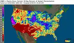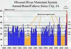 A study by Utah State University[6] examined the buildup of water storage leading to the 2011 Missouri River flooding[7] observed by GRACE satellites indicated that precipitation over the MRB undergoes a profound modulation during the transition points of the Pacific quasi-decadal oscillation and associated teleconnections. The results infer a prominent teleconnection forcing in driving the wet/dry spells in the MRB, and this connection implies persistence of dry conditions for the next 2 to 3 years, which is linked to the 2012–2013 Midwestern drought.