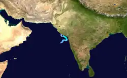 On November 6, the IMD upgraded a low-pressure area into a Depression, designating it ARB 03. The system was forecasted to intensify into a deep depression and move towards the Gulf of Aden in the next 72 hours.[39] On the same day a TCFA was issued by the JTWC.[40] The IMD upgraded the storm into a deep depression on November 8, and forecasted that it would intensify into a cyclonic storm within the next 24 hours[41] which was followed by an upgrade to a tropical storm by JTWC.[42] Under the influence of unfavorable conditions and proximity to land, the system weakened and JTWC issued its final warning.[43] Soon the IMD downgraded the storm into a depression.[44] On November 10, the storm dissipated into a low-pressure area.[45]