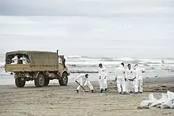 New Zealand Army personnel cleaning oil from Papamoa Beach on 11 October