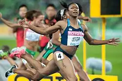 ![]() Carmelita Jeter winning the 100m. In the background Shelly-Ann Fraser-Pryce (4th) and Ivet Lalova (7th). | |||||||