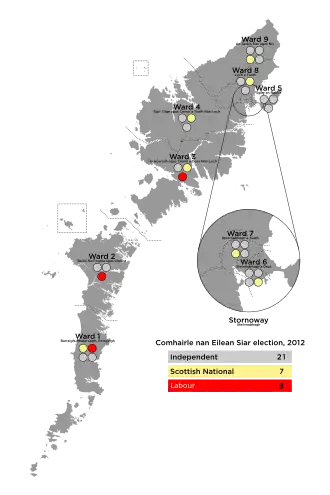 Elections to Comhairle nan Eilean Siar (Western Isles Council) were held on 3 May 2012, the same day as the other Scottish local government elections. The election was the second one using the 9 wards created as a result of the Local Governance (Scotland) Act 2004.[1] Each ward elected three or four Councillors using the single transferable vote system: a form of proportional representation. A total of 31 Councillors were elected.