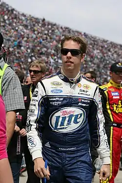 Keselowski appeared in victory lane to celebrate his first win of the season in front of 102,000 people who attended the race.[2] Keselowski also earned $186,770 in race winnings.[2] Afterward, he said, "This car here, this brand-new car that Penske Racing built – everybody back at the shop did a phenomenal job. The last few races have been really good, and I knew we had a shot at winning one if we closed the deal. Matt didn't make it easy."[21] Kenseth, who finished second, said, "I was thinking I could run outside of him [after the restart], but he would roll through there so fast you could never get a run on him. I think he liked the bottom of [Turns] 1 and 2, but I could never get around on the bottom of [Turns] 1 and 2, so that was the right thing to do, to start on the top and leave me on the bottom – for him."[21]