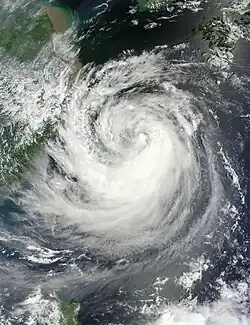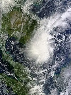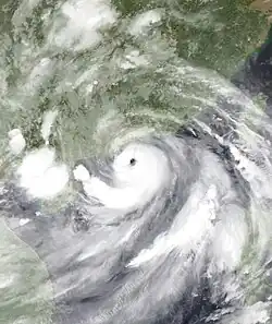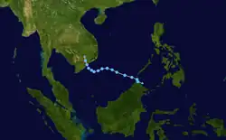 Early on March 30, the JTWC upgraded Pakhar to a Category 1 typhoon, as a banding eye formed; post-analysis later showed that Pakhar didn't reach typhoon intensity.[31][32] Because of land interaction and colder sea surface temperatures, Pakhar weakened to a tropical storm by the next day.[33] On April 1, Pakhar made landfall near Vũng Tàu, Vietnam.[34] As it weakened into a tropical depression, the JMA issued their final advisory by the next day.[35] The system was last noted over Cambodia that same day.[36]