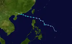 On June 16, the JMA started to issue advisories on a tropical depression, located to the east of Hainan, China.[113] By the next day, the JTWC issued a TCFA on the system, as deep convection was consolidating to its low-level circulation center.[114] The JMA later upgraded the system to a tropical storm, naming it Talim.[115] The JTWC subsequently started to issue advisories on Talim, as convection was quickly developing northward into the center.[116] On June 18, the JTWC upgraded Talim to a tropical storm, as a scatterometer pass supported gale-force winds on the southern periphery of the system.[117] However, as it moved east-northeastward, moderate to strong wind shear caused its deep convection to be displaced to the south, leaving its center partially exposed.[118] By the next day, the system's center became fully exposed due to the continued effects of high wind shear.[119] Despite that, Talim strengthened into a severe tropical storm.[120] On June 20, the JMA downgraded Talim to a tropical storm, as the system tracked towards the Taiwan Strait.[121][122] The PAGASA later assigned the local name Carina on the system, as it entered the Philippine Area of Responsibility.[123] Late on June 20, both the JMA and the JTWC downgraded Talim to a tropical depression, as land interaction significantly weakened the system's organization.[124][125] The JTWC issued their final advisory on the system by the next day.[126]