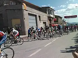 Mini-attacks set the course for the stage as the field remained as one, for much of the first half of the stage.[49] It was not until after 85 km (52.8 mi) that the stage's primary breakaway had been formed. Six riders – BMC Racing Team rider Mathias Frank, Omega Pharma–Quick-Step's Kristof Vandewalle, mountains classification leader Chris Anker Sørensen of Team Saxo Bank, Vacansoleil–DCM rider Tomasz Marczyński, Caja Rural's Marcos García and Nicolas Edet of Cofidis – originally managed to breach the confines of the field, and set off in a bid to extend a substantial advantage of the main field. Javier Ramírez of Andalucía also went clear of the main field, but could not catch up to the sextet out front, and was eventually pulled back by the peloton.[50] At the intermediate sprint, coming after 108 km (67.1 mi) in Santa Coloma de Queralt, the breakaway held a lead of seven-and-a-half minutes over the peloton.[49][50] That gap was reduced as several teams picked up the pace on the front of the peloton; with 50 km (31.1 mi) remaining of the stage, the breakaway group held an advantage of five minutes over the rest of the field, and the time gap was reducing at a rate of a minute per 10 km (6.2 mi).