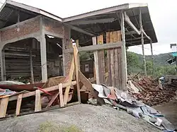 In Central Aceh, 35 deaths were reported.[4] A mosque collapse killed six children and trapped 14 others.[6] Rescuers dug through the rubble throughout the night of 2–3 July, but did not locate any of the trapped children. Numerous landslides occurred in the district and 1,368 houses were destroyed.[13][7] A further 2,135 houses suffered minor damaged.[13] On 3 July, a local official commented "People are still frightened, especially after the aftershocks last night. Nobody dared to stay at home. Everyone slept on the roads or in car parks."[7] The main hospital was overcrowded with patients, causing tents to be set up outside to handle the overflow.[7]