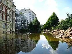 In the state of Saxony, the old town of Grimma, on the Mulde tributary was under meters of water. Authorities were concerned about the Elbe river; in Dresden one of the bridges across the river was closed to traffic.[28] In the city of Magdeburg, authorities declared a state of emergency and said they expected the Elbe river to rise higher than in 2002.[30] In Magdeburg with water levels of five metres (16 ft) above normal about 23,000 residents had to leave their homes on 9 June.[31]
