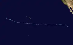 A tropical wave, the same responsible for Tropical Storm Barry in the Atlantic, moved across the eastern Pacific in late June, yielding a broad area of low pressure by June 21. Northwesterly shear initially hindered development of the system, but a subsequent decrease in upper-level winds, as well as the passage of an eastward-moving kelvin wave, led to the formation of a tropical depression by 12:00 UTC on June 23; twelve hours later, the depression intensified into Tropical Storm Cosme. Steered northwest and eventually west-northwest, the cyclone intensified amid favorable atmospheric dynamics, becoming a minimal hurricane by 12:00 UTC on June 25 and attaining peak winds of 85 mph (135 km/h) twelve hours later. A track over cooler waters and into an increasingly stable environment caused Cosme to weaken to a tropical storm by 18:00 UTC on June 26 and further degenerate into a remnant low by 12:00 UTC the next day while located about 690 mi (1,110 km) west-southwest of Cabo San Lucas, Mexico. The remnant low tracked westward prior to dissipating well east-southeast of the Hawaiian Islands on July 1.[28]