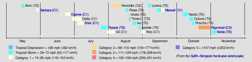 The 2013 Pacific hurricane season was an above average Pacific hurricane season with 21 tropical cyclones forming. Of these, 20 became named storms – 18 in the Eastern Pacific basin (east of 140°W), and 2 in the Central Pacific basin (between 140°W and the International Date Line). Of the 18 named storms in the east, 9 became hurricanes, with one, Raymond, becoming the season's only major hurricane (category three or higher on the Saffir–Simpson hurricane wind scale). In the central, neither named storm became a hurricane. It was also a below-normal season in terms of Accumulated cyclone energy (ACE), as many of its systems were weak and short-lived. The season officially began on May 15 in the Eastern Pacific and started on June 1 in the Central Pacific; both ended on November 30. These dates conventionally delimit the period of each year when most tropical development occurs in these North Pacific basins.[1] The first cyclone, Tropical Storm Alvin, formed on May 15, and the last, Tropical Storm Sonia, dissipated on November 4.