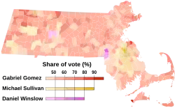 Markey: 40–50% 50–60% 60–70% 70–80% 80–90% >90% Gomez: 40–50% 50–60% 60–70% 70–80% Tie: 40–50% 50% No votes | |||||||||||||||||