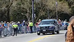 After the bombings that took place during the 2013 Boston Marathon, killing three and injuring over 260, police vowed to institute additional security measures—including bag checks and additional barriers—while maintaining a friendly, happy atmosphere.[12] Police banned backpacks, strollers, suitcases, glass containers, some costumes and props, weight vests, and items larger than 5 by 5 inches (13 cm × 13 cm).[13] Those with larger bags were subject to being searched.[14] Unregistered runners previously known as "bandits" also were not allowed to participate.[14] More than 3,500 uniformed Boston Police officers were present for security. Overall, the association was aiming to keep the event as safe as possible while still maintaining the usual fun and excitement of it.