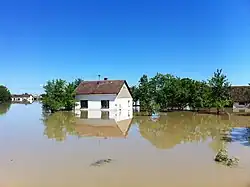 Croatia was affected by the floods to a lesser extent than Serbia or Bosnia.[47] The most critical area was in southern Slavonia. The embankment on the Sava River was breached near Rajevo Selo and Račinovci, and thus evacuation was ordered for Gunja, Rajevo Selo and Račinovci. As of 19 May, around 15,000 people in easternmost parts of Croatia were evacuated from their homes.[48] One of the most critical points was the embankment of the Sava river in Slavonski Šamac, where the confluence of the Bosna and Sava is located. At that point the embankments were under severe pressure caused by the huge amount of water coming from Bosnia. Several officials stated that if this embankment were breached, the entire region of southern Slavonia, with a population of over 300 000, would be flooded.[49] There were also floods in Banovina region, in the towns of Hrvatska Kostajnica and Dvor, mostly caused by the river Una, whose level had not been as high since 1955.[50] Video: http://vimeo.com/96164094