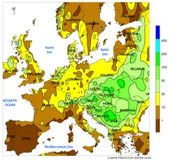 On 13 May, a low-pressure area formed over the Adriatic Sea, as polar air from Central Europe penetrated into the Mediterranean basin. The cold polar air mass met with humid subtropical air, leading to very low pressure. On 14 May, the low moved over Southeast Europe, becoming stationary. As a result, extremely heavy rain fell within the region; Serbia (in the area around Belgrade) and Bosnia were most affected.[18] Serbian and Bosnian meteorologists named the formed cyclone "Tamara".[19][20] On 15 May, the daily amounts of rainfall broke historical records in Belgrade (107.9 mm), Valjevo (108.2 mm) and Loznica (110 mm).[21] By 15 May, the monthly rainfall in Belgrade had broken the historical record (175 L from 1897), reaching 205 L.[22] By Saturday, May 17, the rain had subsided, and the weather gradually became warmer and sunnier, somewhat easing relief and rescue efforts. On 18 May, the cyclone moved further northwest.[20]