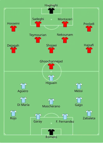 In a match where Argentina dominated in terms of possession and shots,[13] they scored the only goal one minute into second half injury time when Lionel Messi received a pass from Ezequiel Lavezzi on the right wing, dribbled inside and curled a left-footed shot past the outstretched hands of the Iranian keeper Alireza Haghighi.[14] Before the goal, Iran had chances to score, but Argentina goalkeeper Sergio Romero was able to save Ashkan Dejagah's header and Reza Ghoochannejhad's shot, and Dejagah also had a penalty appeal turned down when Argentina defender Pablo Zabaleta tackled him in the area but only just got his toe to the ball.[15] With the win, Argentina were guaranteed to advance to the knockout stage.
