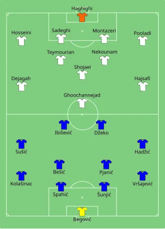 Bosnia and Herzegovina, which had already been eliminated, led 1–0 at half-time through a goal by Edin Džeko, shooting low with his left foot after he received a pass from Miralem Pjanić. Pjanić extended the lead in the second half when he slotted low past the goalkeeper, after receiving a through ball from Tino-Sven Sušić. Iran, which had to win and also hoped Nigeria lost to Argentina to have any chance for qualification to the knockout stage, reduced the deficit after Reza Ghoochannejhad tapped home from close range from a Javad Nekounam cross.[25] However, Bosnia and Herzegovina scored a third goal when Avdija Vršajević slotted home with his right foot after Sejad Salihović played him in on the right, sealing their first win in World Cup finals history, and also confirming Iran's elimination, meaning that they failed to advance to the knockout stage for all four of their World Cup campaigns.[26]
