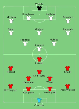 Algeria took a one-goal lead in the first half after Sofiane Feghouli converted a penalty kick, awarded for a foul on him by Jan Vertonghen. Belgium came back with two goals in the second half, both scored by substitutes.[2] The equaliser was scored by Marouane Fellaini, heading in a cross from the left by Kevin De Bruyne, followed by the game winner scored by Dries Mertens from a pass by Eden Hazard.[3]