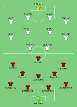 After a goalless first half, the two teams traded goals by substitutes in the second half as the match finished 1–1. First, Han Kook-young passed to Lee Keun-ho, and his long range shot was spilled by Russian goalkeeper Igor Akinfeev into the net.[6] Russia equalised after Alan Dzagoev's shot was parried by South Korean goalkeeper Jung Sung-ryong, the clearance hit Andrey Yeshchenko, and Aleksandr Kerzhakov scored from close range.[7]