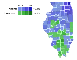 Rauner defeated Quinn in the general election with 50.3% of the vote to Quinn's 46.4%, winning every county in the state except for Cook County, home to the city of Chicago and 40% of the state's residents.[2][3] Quinn was the only incumbent Democratic governor to lose a general election in 2014 and remained the last one to do so until Nevada's Steve Sisolak in 2022. Rauner became the second Republican to be elected governor of Illinois while carrying all but one county, the other being Jim Edgar in 1994. This was the only time since 1998 that a Republican was elected Governor of Illinois.