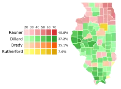 By early summer 2013, the field seeking the Republican nomination was set at four candidates.[34] Two of them, state senators Bill Brady and Kirk Dillard, had sought the nomination in 2010, with Brady edging out Dillard by 193 votes, but ultimately losing to Pat Quinn by less than 1 percent.[35] Dan Rutherford, who was elected state treasurer in 2010 after serving as a state representative and state senator, formally entered the race on June 2.[36]