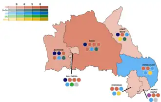 ![]() Mid and East Antrim 2014 Council Election Results by DEA (Shaded by plurality of FPVs) | |||||||||||||||||||||||||||||||||||||||||||||||||||||||||||||||||||||||||||