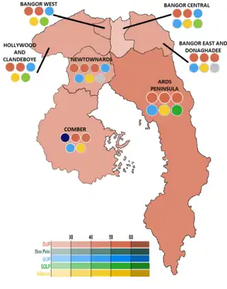 ![]() Ards and North Down 2014 Council Election Results by DEA (Shaded by plurality of FPVs) | ||||||||||||||||||||||||||||||||||||||||||||||||||||||||||||||||||||||||