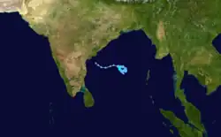 Under the influence of an active Intertropical Convergence Zone, the season got off to one of its earliest starts on record, with a depression developing over the Andaman Sea during January 4.[1] Over the next couple of days the system moved westwards and made landfall on Sri Lanka, where it weakened into an area of low pressure.[1] Over the next few months the basin remained quiet, before the precursor cyclonic circulation to Depression BOB 02 developed during May 18.[1] As the cyclonic circulation developed it helped the southwest monsoon, advance into the Andaman Sea and parts of the Bay of Bengal, before it developed into a depression during May 21.[2] The depression was short lived and weakened into a remnant low, over the Bay of Bengal during May 23.[1] The southwest monsoon was subsequently delayed by six days setting in over the Indian state of Kerala and eventually moved over the state during June 6.[2] Over the next few days the monsoon set in further over the Bay of Bengal, while it was enhanced over the Arabian Sea by the formation of Cyclonic Storm Nanauk.[1][2] By June 18, the monsoon covered most of the North Indian Ocean and parts of Gujarat, Konkan & Goa, Odisha, Jharkhand, Bihar and Gangetic West Bengal.[2]
