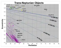 2014 ST373 is a distant minor planet and trans-Neptunian object (TNO) beyond the orbit of Neptune and the Kuiper cliff.[3][4] As of February 2020, it has the 8th highest perihelia of all known minor planets. Based on a still sufficiently determined perihelion a of 50.2 AU, it is not a member of the scattered disc population, as these objects are thought to have been ejected from the classical Kuiper belt into their current orbits by gravitational interactions with Neptune (semi-major axis of 30.1 AU), and typically have highly eccentric orbits and perihelia of less than 38 AU. 2014 ST373's orbit, however, has never brought it close enough to Neptune to be gravitational disturbed.