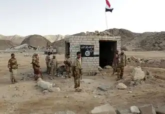 On 2 May, Yemeni forces killed five AQAP fighters in Mayfa'a and destroyed three of their vehicles, one of which was mounted with anti-aircraft guns.[28][25] The Yemeni army blocked the main road connecting Ataq, the capital of Shabwah, to Azzan and Habban.[25] On 3 May, two soldiers were killed and four others wounded during clashes in Sanaj. Five militants were killed in the clashes, including Chechen AQAP commander Abu Islam al-Shishani.[29][25] AQAP confirmed the death of Ali bin Likra al-Kazimy, its local commander in al-Mahfad, from the airstrikes on the Wadi al-Khayyala camp in April.[5][30] Suspected militants wounded two soldiers at a central bank building in Shabwah after throwing hand grenades into it.[31] AQAP released seven soldiers captured the previous day after tribal mediation efforts.[25]