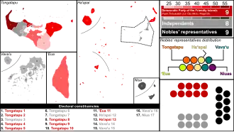 Under the electoral reforms introduced prior to the 2010 election, Tonga is divided into seventeen single-member constituencies for the election of the people's representatives. These overlap with the four constituencies for the election of the nobles' representatives: a four-member constituency covering Tongatapu and ʻEua, a two-member constituency covering Vavaʻu, a two-member constituency covering Haʻapai, and a single-member constituency covering the islands of Niuafoʻou and Niuatoputapu. In both types of constituency, the first-past-the-post electoral system is applied.[2]
