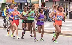 The first runners hit the 3.1-mile (5 km) point in 17:21 and the 6.2-mile (10 km) mark in 34:27.[7] By the halfway point (1:12:54), a nine-woman lead pack had emerged led by Portuguese runner Sara Moreira. They remained together until the 18-mile (29 km) mark, where a group containing Kenyans Mary Jepkosgei Keitany and Priscah Jeptoo, along with Ethiopians Aselefech Mergia and Tigist Tufa started to pull away. At the 20-mile (32 km) mark, Keitany increased her pace and began recording sub 5:20 miles. Tufa kept up with Keitany until the 22-mile (35 km) point before falling away. Keitany won the race in 2:24:25, a full minute and seven seconds in front of second placed Mergia who had overtaken Tufa in the final mile. Tufa trailed a further eighteen seconds behind in third place. Keitany's win marked the first time a woman had defended the New York Marathon title since Briton Paula Radcliffe in 2008.[2]