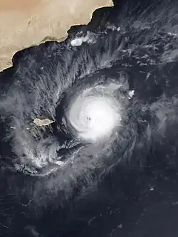 A low-pressure area formed over the Arabian Sea on October 26.[47] It slowly consolidated, prompting the IMD to classify it a depression on October 28.[48] Later the same day, the JTWC issued its Tropical Cyclone Formation Alert (TCFA) for the system, and the IMD upgraded the storm to deep depression intensity.[49][50] Further intensification ensued, causing the IMD to upgrade the system to a cyclonic storm, naming it Chapala.[51] Over the following hours, the storm intensified into a severe cyclonic storm and further into a very severe cyclonic storm.[52][53] Rapid intensification commenced and Chapala was upgraded into an extremely severe cyclonic storm on October 30.[54] On November 3, it made landfall in Yemen as a very severe cyclonic storm, making it the first tropical cyclone at hurricane intensity to make landfall in the country on record.[55] Chapala rapidly weakened over the mountainous terrain of mainland Yemen and was last noted as a low-pressure area the following day.