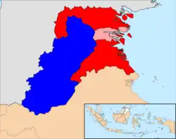 Early quick count results by Indikator favored the Irianto-Udin pair.[10] During a plenary vote-tallying meeting on 19 December, supporters of the Jusuf-Marthin pair rioted in Tanjungselor, burning cars and buildings in the gubernatorial complex and forcing the deployment of soldiers.[11] Following the riots, vice governor candidate Marthin Billa was arrested on suspicion of organizing them although he was not jailed and was only required to report weekly.[12][13]