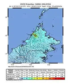 The earthquake occurred on 5 June 2015 at MST (23:15:43 UTC) at a depth of approximately 18.1 km (11.2 mi),[2] with its epicentre approximately 15 km (9.3 mi) north of Ranau and lasting for thirty seconds.[4][18] The earthquake was initially reported as 6.0 Mw by the United States Geological Survey (USGS) while the Malaysian Meteorological Department (MetMalaysia) reported the earthquake's magnitude to be 5.9 Ms.[1][19]