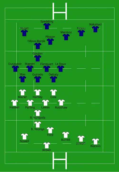 | Try: B. Youngs (2) 1' c, 35' c Watson 30' c Ford 46' c Nowell (2) 53' c, 74' c B. Vunipola 63' c Con: Ford (7/7) 3', 30', 36', 46', 54', 63', 75' Pen: Ford (2/3) 26', 40' | Report | Try: Tillous-Borde 13' m Nakaitaci 17' c Mermoz 42' c Debaty 59' m Kayser 65' m Con: Plisson (2/3) 18', 42' Kockott (0/2) Pen: Plisson (1/3) 10' Kockott (1/1) 51' |