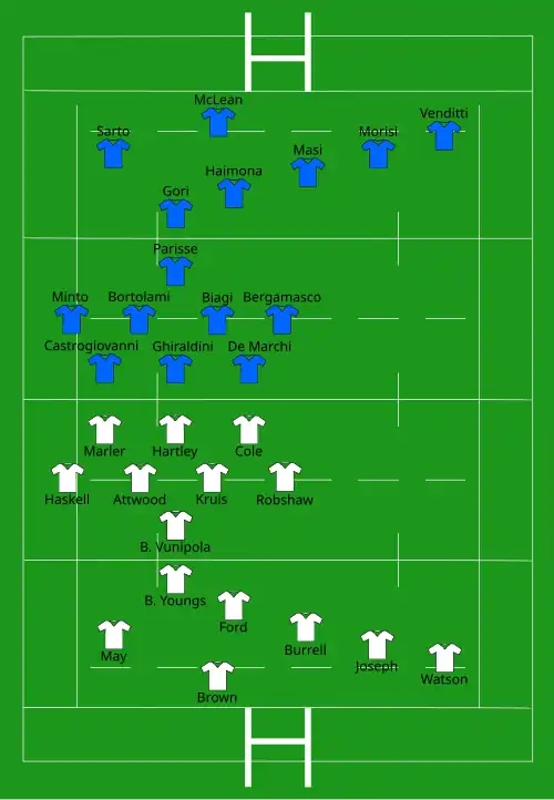 | Try: B. Vunipola 23' m Joseph (2) 26' c, 60' c B. Youngs 54' c Cipriani 63' c Easter 68' m Con: Ford (3/4) 28', 55', 62' Cipriani (1/2) 63' Pen: Ford (3/3) 20', 45', 57' | Report | Try: Parisse 3' m Morisi (2) 49' m, 78' c Con: Allan (1/1) 79' |