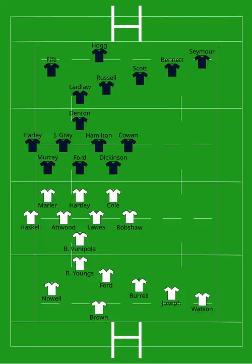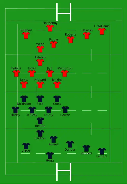 | Try: Hogg 9' c Welsh 79' c Con: Laidlaw (1/1) 10' Russell (1/1) 79' Pen: Laidlaw (3/3) 17', 44', 54' | Report | Try: Webb 33' c Davies 63' c Con: Halfpenny (2/2) 34', 64' Pen: Halfpenny (4/5) 6', 19', 31', 48' |