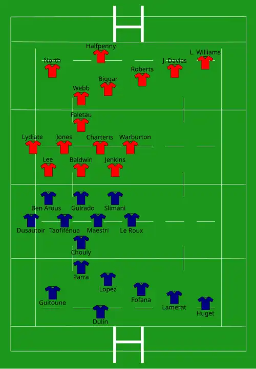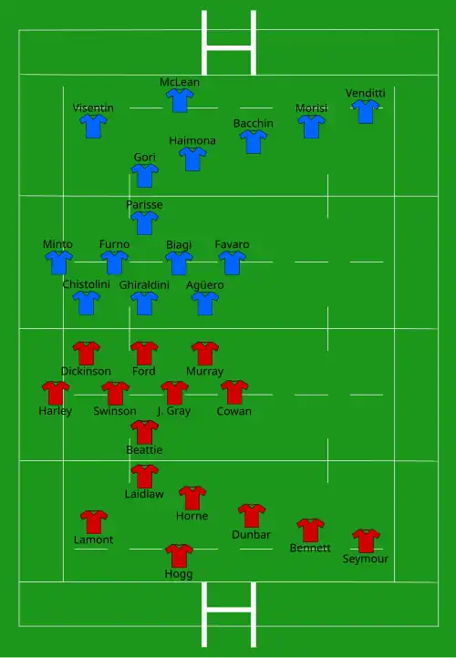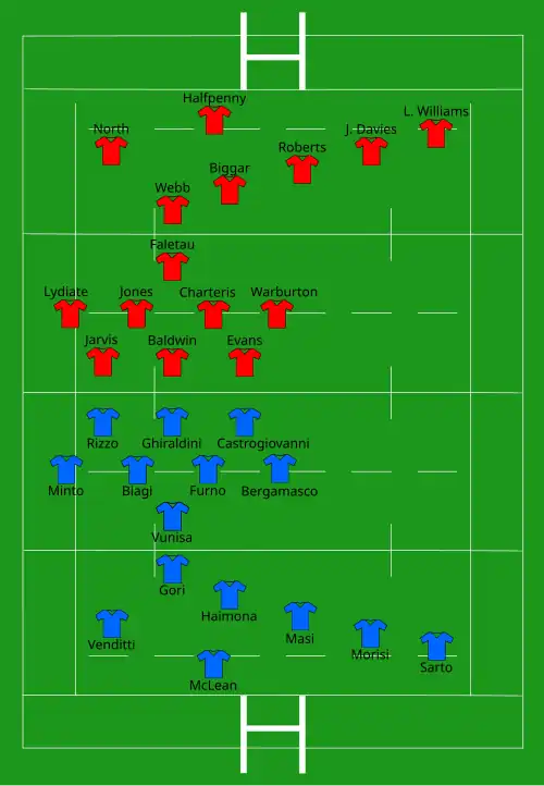 | Try: Venditti 24' c Sarto 79' c Con: Orquera (2/2) 26', 80' Pen: Haimona (1/1) 1' Orquera (1/1) 10' | Report | Try: Roberts 18' m L. Williams 47' c North (3) 49' c, 54' c, 59' c Webb 66' m Warburton 68' c S. Williams 73' c Con: Biggar (6/7) 47', 50', 55', 59', 69', 73' Pen: Halfpenny (2/2) 7', 12' Biggar (1/1) 40' |