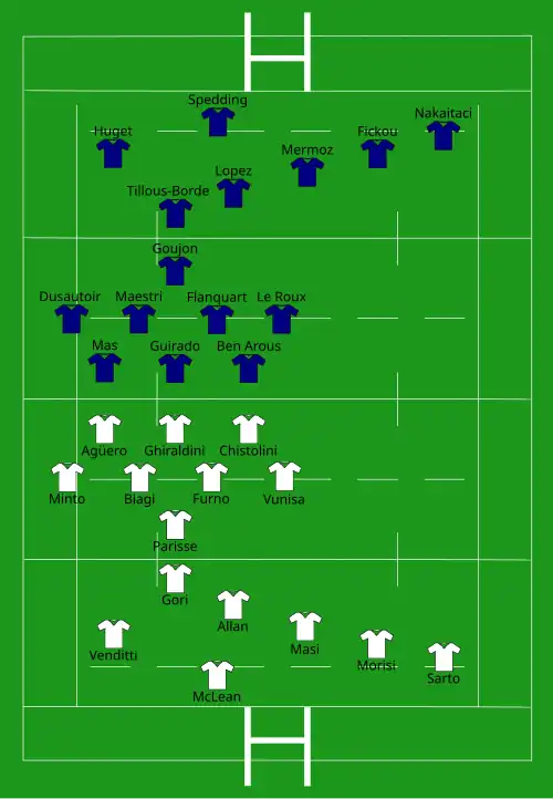 | Report | Try: Maestri 45' c Bastareaud 80' c Con: Plisson (2/2) 46', 80' Pen: Lopez (2/2) 28', 34' Spedding (1/2) 40' Plisson (2/2) 41', 57' |
