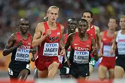 The Kenyan dominance of this event is well noted. Coming off the race in Monaco, running the #3 non-Kenyan time in history even after falling over the last barrier and losing three to five seconds, Evan Jager had the confidence to run with the Kenyans at the front of the pack. Still, three of the Kenyans in this race were ahead of him on that list. This was a strategic race, with the Kenyan team asserting dominance in front of the pack but not running away from the field. Non-team player, multi-defending champion Ezekiel Kemboi didn't share the lead duties, instead spending the entire first six laps on the rail about 2-3 runners behind the lead. At the bell, Jager took the lead and tried to launch his sprint. As the race accelerated, only the four Kenyans and Brahim Taleb were able to stay at the front. Conseslus Kipruto and Jairus Kipchoge Birech passed Jager a step before the barrier at the beginning of the backstretch. After landing that barrier, defending champion Kemboi took off sprinting passing Jager on the inside and his compatriots on the outside before taking the next barrier clearly in the lead. After opening up a gap through the water jump, Conseslus came back swinging wide on the home stretch looking like he was going to run past Kemboi. Instead Conseslus had to noticeably adjust his stride, taking the final barrier awkwardly. Kemboi took it smoothly and sprinted home to victory, drifting out only to lane 3 this time in celebration. Behind them, Birech took his final barrier awkwardly and Brimin Kipruto caught him for the bronze medal.[3]