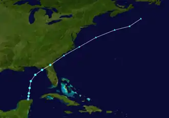 In Cuba, heavy rainfall resulted in flooding in the western portions of the island, especially Pinar del Río Province. Water left several roads impassable and inundated crops in some areas;[45] about 840,000 acres (340,000 ha) of crops were flooded overall.[46] In Old Havana, mudslides severely damaged three homes and impacted numerous others to a lesser degree.[47][48] The storm also produced heavy rainfall over portions of Florida, resulting in flooding in some areas, especially Hillsborough and Pinellas counties.[24] There, the freshwater flooding was compounded by coastal flooding from high tides. Winds caused over 93,300 power outages throughout the state.[49] The storm spawned at least one tornado, which knocked down trees and damaged several cars and homes in Jacksonville.[24] Four fatalities occurred in the Florida Panhandle due to drowning.[50] Heavy rainfall was also observed in portions of Georgia, North Carolina, and South Carolina. Two additional drowning deaths occurred in Georgia and one in Alabama. Damage throughout the East Coast reached $1.04 million.[51]