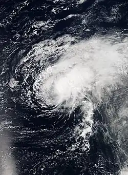 On August 17, the NHC highlighted the potential for tropical cyclogenesis off the western coast of Africa in subsequent days.[61] A weak area of low pressure associated with a tropical wave emerged into the eastern Atlantic three days later,[62] and the disturbance steadily coalesced into a tropical depression by 12:00 UTC on August 22, about 305 mi (490 km) southwest of the southernmost Cabo Verde Islands.[28] The depression organized while heading northwest, intensifying into Tropical Storm Gaston six hours later and attaining hurricane intensity by 12:00 UTC on August 24, in accordance with data from satellites and a NASA Global Hawk unmanned aircraft.[28][63] After its initial peak in intensity, Gaston's satellite appearance began to degrade as an upper-level low imparted strong southwesterly shear on the cyclone,[64] causing it to weaken back to a tropical storm.[28] Upper-level winds slackened early on August 27, and a timely microwave pass highlighted the presence of a low-level eye well embedded in the storm's central dense overcast, indicating the resumption of Gaston's intensification phase.[65]