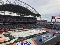 The Jets originally announced in 2013 that they had reached an agreement with the NHL to host the game, to celebrate five years since the Atlanta Thrashers moved to Winnipeg, returning the NHL to Manitoba after a fifteen-year absence. The team had originally wanted to host the game in 2015–16, its actual fifth season.[2] However, a disagreement occurred between the NHL and the Winnipeg Blue Bombers over the game's exact date: the league wanted it held in December 2015 while the football team became concerned that this date was too close to the 103rd Grey Cup being held at the stadium on November 29.[3] In January 2015, the Jets announced that they could not reach an agreement to finalize a date for the Heritage Classic during the 2015–16 season.[4] On March 6, 2016, the NHL officially announced that the Jets would host the Oilers in the 2016 Heritage Classic during the 2016–17 NHL season; the Blue Bombers would be on a bye week that week and would play their second last home game before the Heritage Classic on October 8. This gave the NHL nearly two weeks to prepare the stadium for the game.[5]