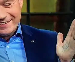 In contention for the position were Brendan Howlin, Seán Sherlock and Alan Kelly.[3] Kelly announced his intention to seek leadership of the Labour Party on 13 May.[4] That evening, he appeared as a guest on The Late Late Show, during which he high fived the host Ryan Tubridy, hinted that he would not necessarily have a deputy leader and appeared to have a mysterious message scrawled on his left hand.[5]