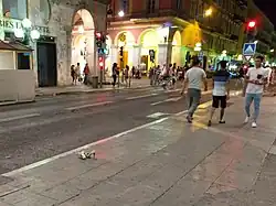 Travelling at close to 90 kilometres per hour (56 mph) and mounting the pavement as if out of control, it hit and killed numerous bystanders before passing the Centre Universitaire Méditerranéen, where it was first reported by municipal police.[38][43][44] 400 metres (1,300 ft) from the children's hospital, at the intersection with Boulevard Gambetta, the truck accelerated and mounted the kerb to force its way through police barriers—a police car, a crowd control barrier and lane separators[45]—marking the beginning of the pedestrianised zone.[46]
