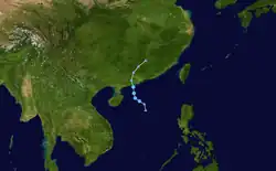 During May 25, Tropical Depression 01W developed over the northern South China Sea, about 600 km (375 mi) to the south of Hong Kong, China.[21][22] The system subsequently moved north-westwards and slightly developed further, before it made landfall near Yangjiang in Guangdong, China during the next day.[22] The system subsequently quickly weakened and degenerated into an area of low pressure during May 27.[22]