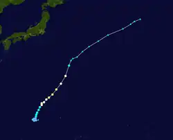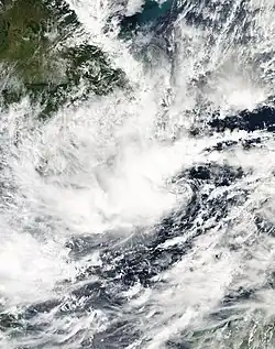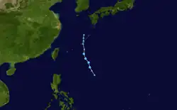 During July 14, a tropical disturbance developed about 400 km (250 mi) to the west-northwest of Guam.[46] At this time atmospheric convection surrounding the system was flaring, over the system's weak but developing low level circulation center.[46] However, as a subtropical ridge of high pressure extended a significant amount of dry air over the disturbance, conditions were assessed to be marginally favorable for further development of the system.[46] Over the next couple of days the system gradually developed further as it moved north-westwards and was classified as a tropical depression by the JMA during July 15.[47][48] After the system had consolidated further, it was classified as Tropical Depression 03W by the JTWC during July 17.[49] However, the system weakened during that day as it moved polewards, along the western edge of the subtropical ridge of high pressure, into an area of increasing vertical wind shear.[49] As a result, the JTWC expected the system to quickly dissipate and issued their final advisory later that day.[50] However, over the next couple of days the system continued to move northwards and impacted the Ryukyu Islands, before it was last noted by the JMA during July 20.[51][52]