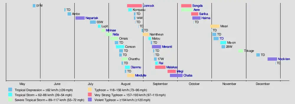 In September, Typhoon Meranti became the strongest typhoon in terms of pressure since Typhoon Megi in 2010, as well as the strongest typhoon in terms of sustained winds since Typhoon Haiyan in 2013, and the second-strongest tropical cyclone worldwide in 2016, only behind Cyclone Winston, in terms of pressure. Typhoon Megi reached its peak intensity as a Category 3 typhoon while making landfall over Taiwan. Both Meranti and Megi made landfall in Fujian, China, and they caused a total of US$3.6 billion of damage. Rai became a weak tropical storm before it made landfall in Vietnam, Laos and Thailand in mid-September, causing flooding and moderate damage. Typhoon Malakas impacted Japan with a total of nearly $740 million of damage as a Category 4 typhoon. In late September and early October, Typhoon Chaba reached Category 5 super typhoon intensity and became the strongest tropical cyclone to make landfall in South Korea since Sanba in 2012. Chaba also caused 7 deaths in the country.[14] A tropical depression formed east of the International Date Line on October 3, and entered the basin before developing into Typhoon Songda. Songda struck the Pacific Northwest region of the United States and Canada as a powerful extratropical cyclone.[15] Severe Tropical Storm Aere affected parts of Southeast Asia in mid-October, including the worst flooding in Vietnam since 2010, causing a total of US$209 million of damage.[16][17] Later, Typhoon Sarika became a powerful typhoon, and affected the Philippines, China and Vietnam, causing severe damage as well as severe flooding in southern China. After Sarika, Typhoon Haima reached Category 5 super typhoon strength before impacting the Philippines and China, causing a total of US$1.93 billion in damages. Haima was the most severe tropical cyclone to affect Hong Kong in October since 1995. In early November, a tropical depression made landfall in Southern Vietnam and caused heavy flooding throughout central and southern Vietnam, causing moderate damage. In late December, Nock-ten became the strongest Christmas tropical cyclone on record anywhere in the world since at least 1960 in terms of 1-minute sustained winds, before impacting the Philippines.[18][19]
